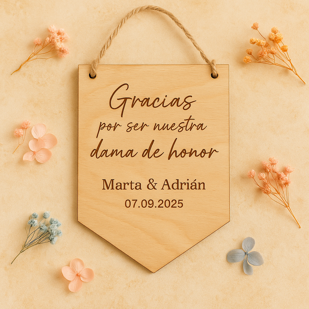 Regalos para las damas de honor: tote bag, neceser, pulsera con inicial, vaso inox, espejo, chapas y camisetas. Personaliza nombres/fecha y colores, diseño a juego con tus invitaciones, packs ahorro y envío rápido en España.