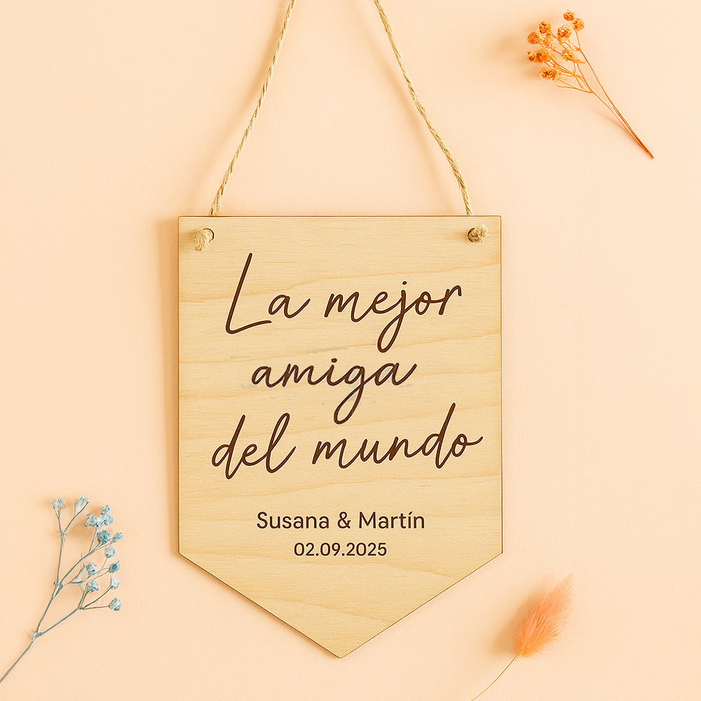 Para ese grupo que siempre está ahí. Diseñamos regalos personalizados para amigos con nombres y fecha, mensajes a tu estilo (divertidos o emotivos) y estética coordinada con vuestras invitaciones. Acabados cuidados, presentación elegante y opciones de packs para la cuadrilla.