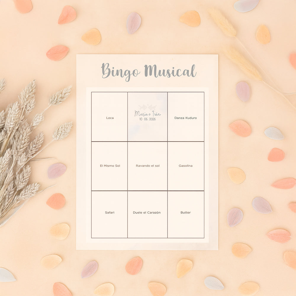 Bingo musical de boda personalizado. Un juego divertido y diferente para animar a tus invitados y llenar tu celebración de alegría.