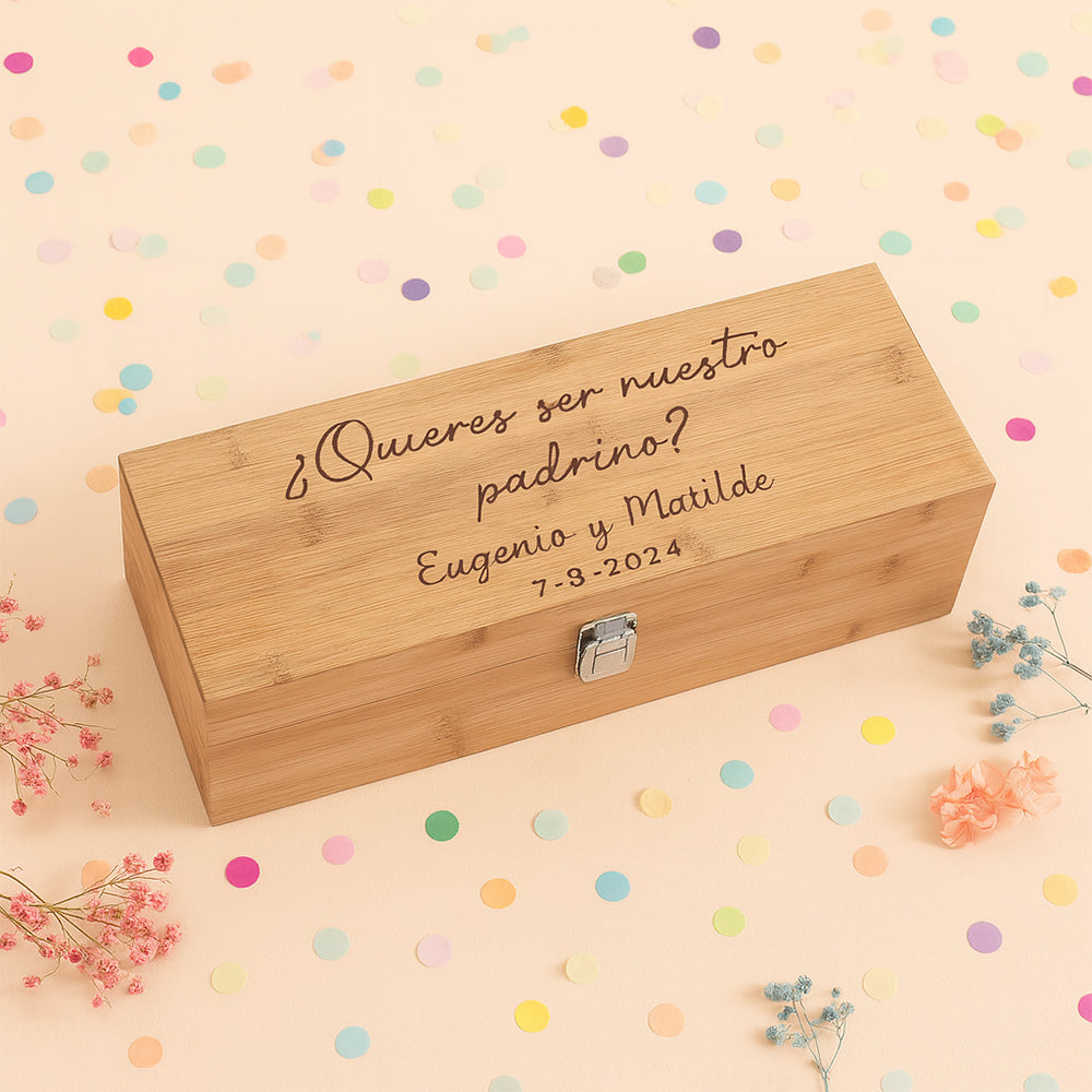 Para quienes os acompañan en el gran día. Diseñamos regalos personalizados para padrinos y madrinas con dedicatorias, nombres y fecha, tipografías y paleta a juego con vuestras invitaciones. Acabados cuidados, presentación elegante y posibilidad de coordinar con el resto de la papelería. Opciones económicas y packs para grupos.