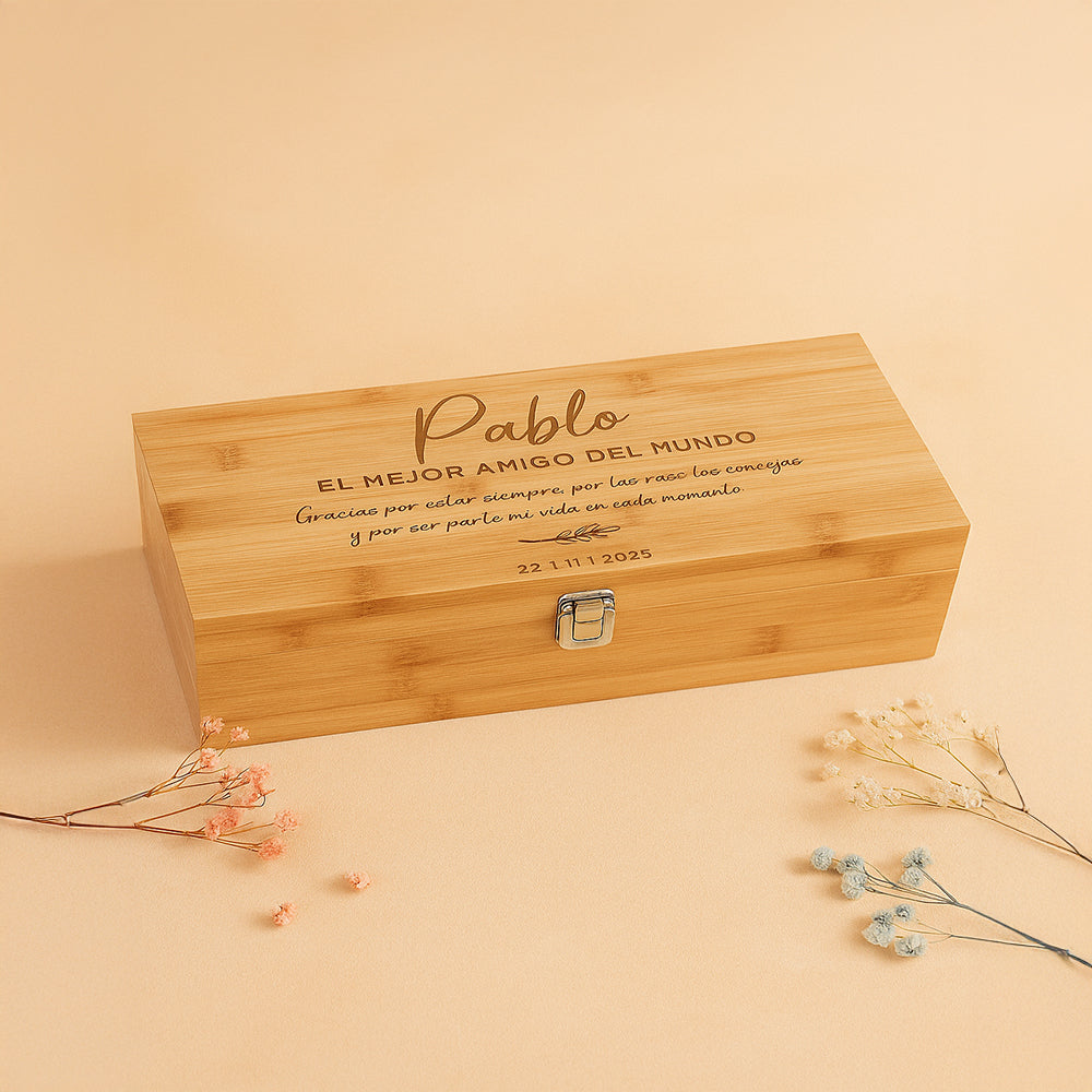 Para ese grupo que siempre está ahí. Diseñamos regalos personalizados para amigos con nombres y fecha, mensajes a tu estilo (divertidos o emotivos) y estética coordinada con vuestras invitaciones. Acabados cuidados, presentación elegante y opciones de packs para la cuadrilla.