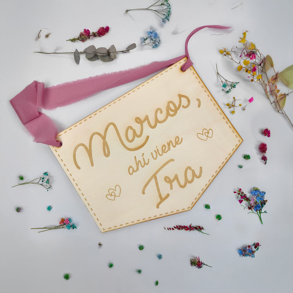 Cartel de madera Aquí viene la novia. Un detalle personalizado y emotivo para hacer aún más especial la entrada a tu boda.