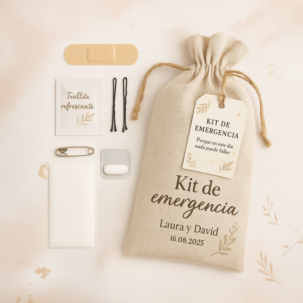 Kit de emergencia para bodas personalizado. Un detalle práctico, original y útil que sorprenderá a todos tus invitados.