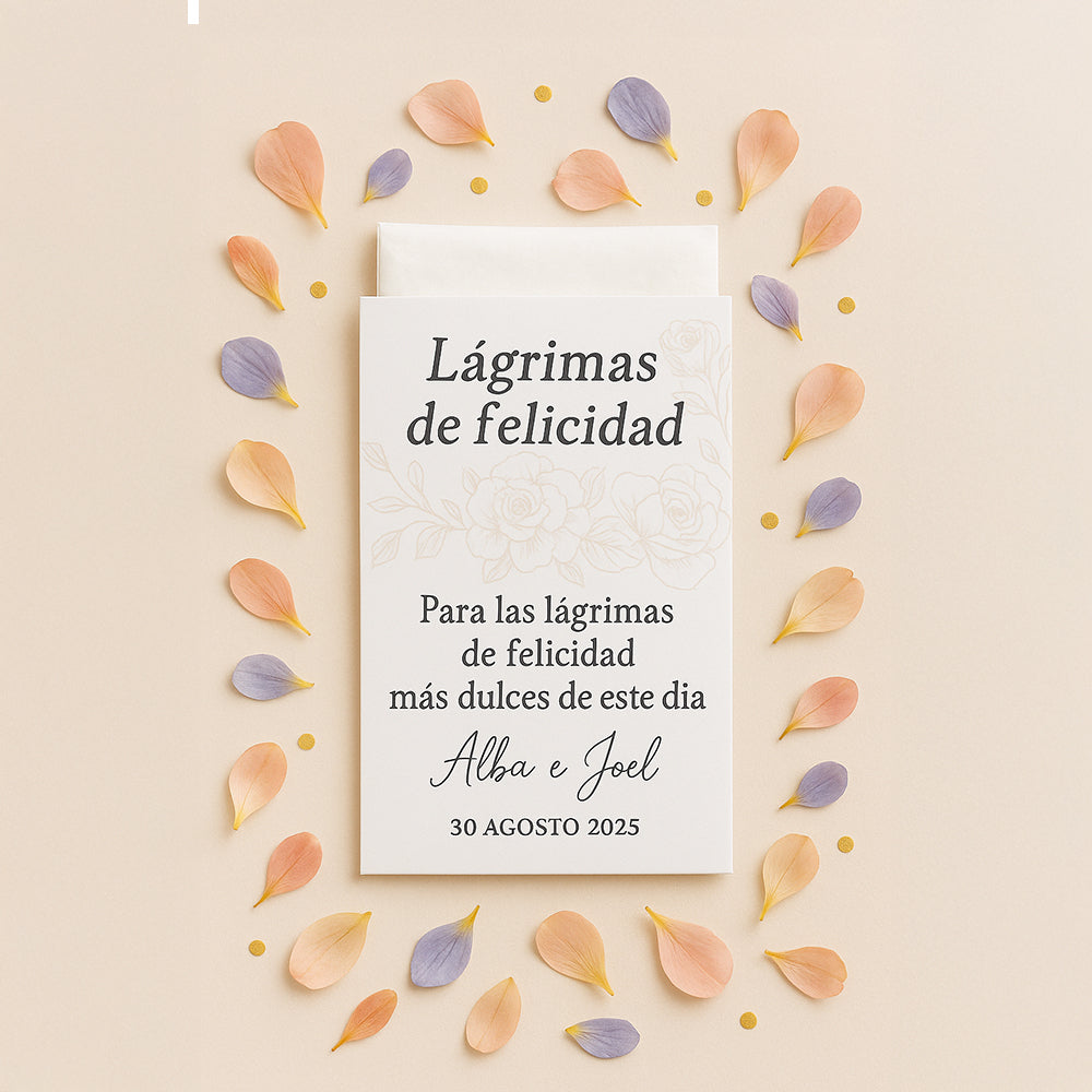 Las Lágrimas de la Felicidad son un detalle original y emotivo para tu boda. Un gesto sencillo que ofrece a tus invitados pañuelos personalizados para esos momentos únicos de emoción durante la ceremonia. Un recuerdo bonito, práctico y lleno de significado que no puede faltar en tu gran día.