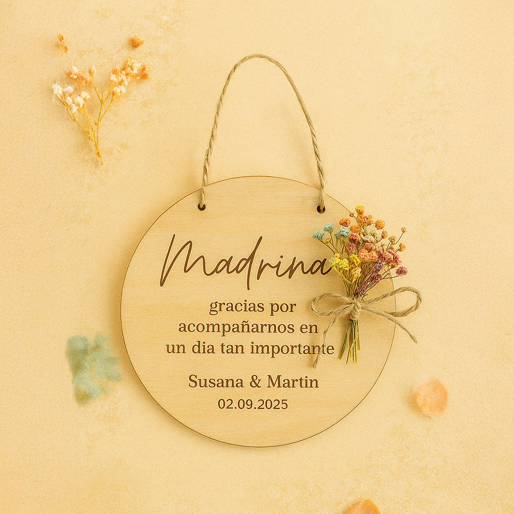Para quienes os acompañan en el gran día. Diseñamos regalos personalizados para padrinos y madrinas con dedicatorias, nombres y fecha, tipografías y paleta a juego con vuestras invitaciones. Acabados cuidados, presentación elegante y posibilidad de coordinar con el resto de la papelería. Opciones económicas y packs para grupos.