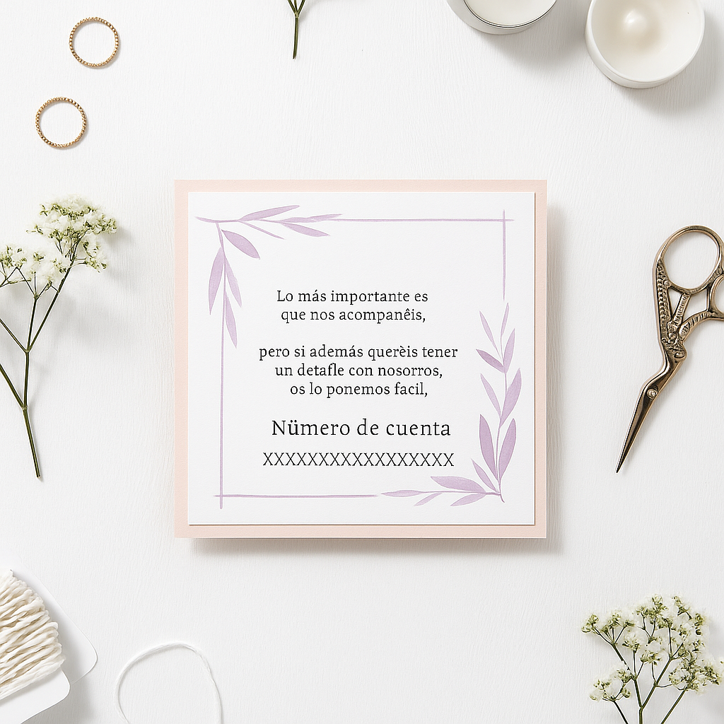 Tarjetas IBAN/Bizum para bodas, a juego con tus invitaciones. Personalizamos texto, iconos y colores en papeles premium. Packs económicos y envío rápido en España.