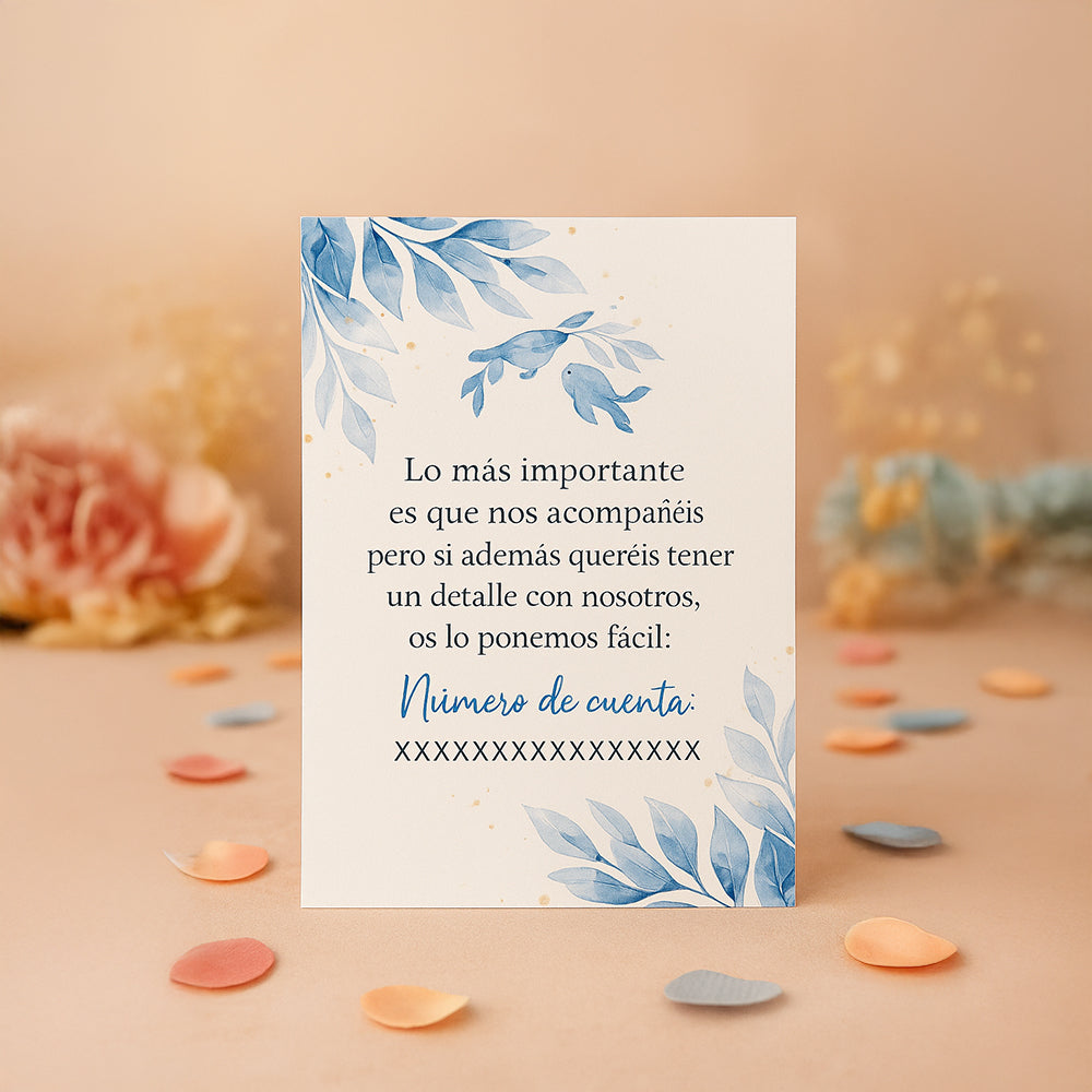 Tarjetas IBAN/Bizum para bodas, a juego con tus invitaciones. Personalizamos texto, iconos y colores en papeles premium. Packs económicos y envío rápido en España.