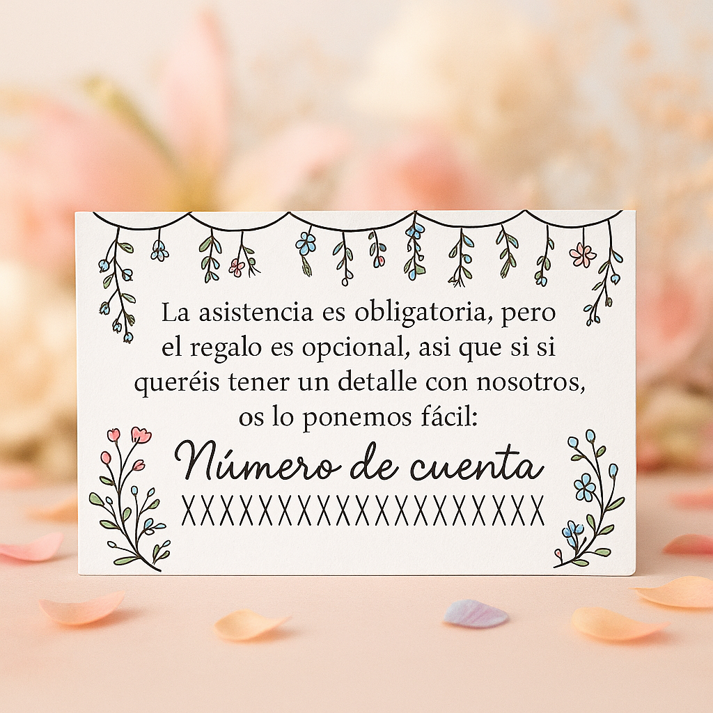 Tarjetas IBAN/Bizum para bodas, a juego con tus invitaciones. Personalizamos texto, iconos y colores en papeles premium. Packs económicos y envío rápido en España.